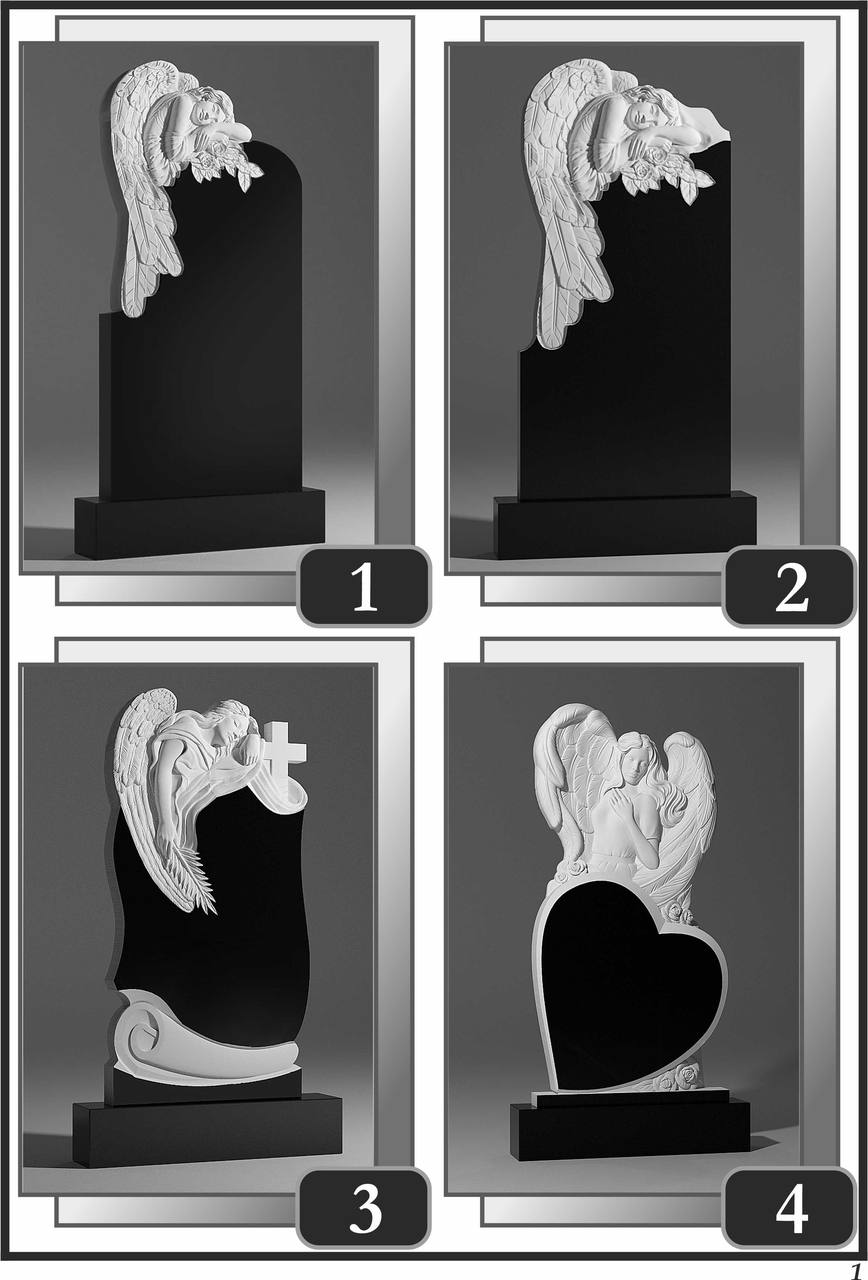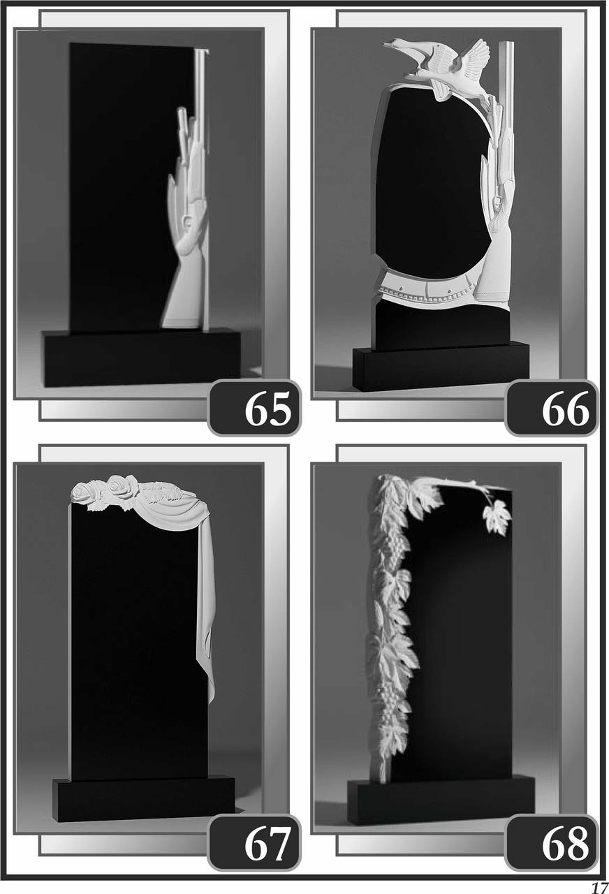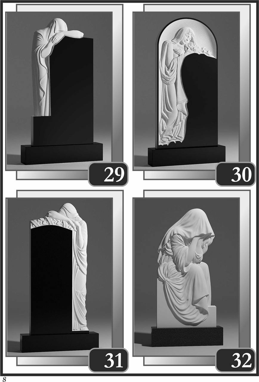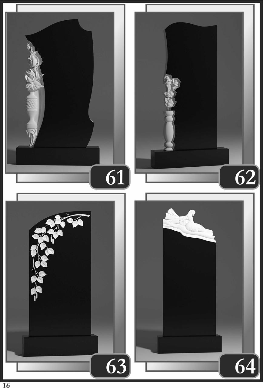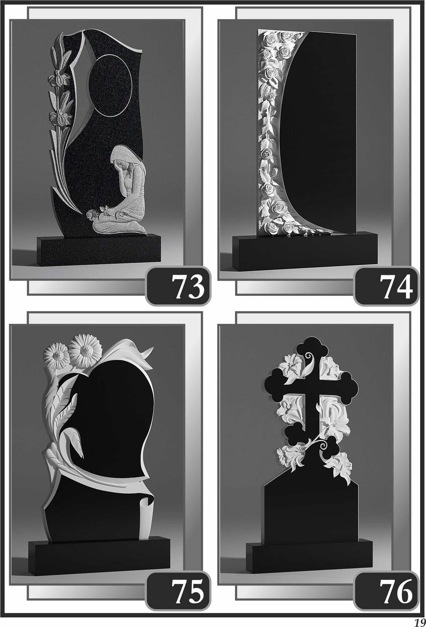На сторінці зібрані приклади пам’ятників за основними напрямками: від одинарних і подвійних рішень до скульптурних композицій та фотоелементів.